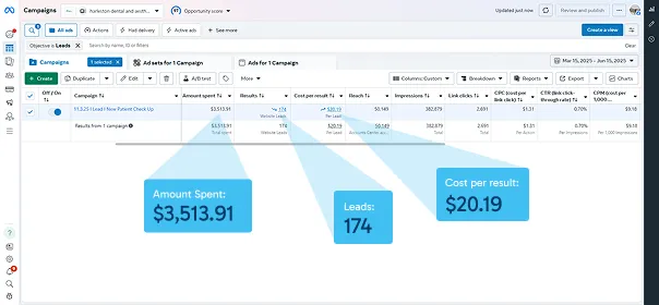 With a total ad spend of $3,513.91, we helped Harleston Dental Clinic generate 174 high-quality leads, bringing the cost per lead down to just $20.19.